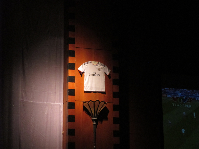 La camiseta de Real Madrid colgada al lado de la pantalla de 300 pulgadas