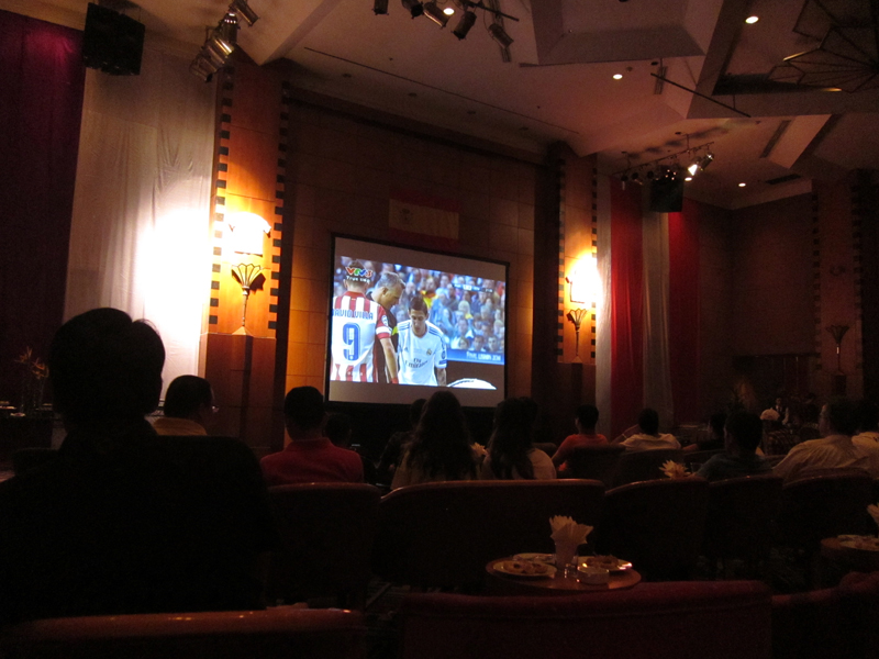 (VOVworld) – A la una y media de la madrugada del domingo, las calles de Hanoi son tranquilas. Las luces están apagadas en medio del silencio. Sin embargo, en un rincón de la capital, el animado ambiente invade por completo la segunda planta del Hotel Melia Hanoi donde se va a proyectar en vivo el partido de fútbol de la final de la Liga de Campeones de la UEFA 2013-2014 entre Real Madrid y Atlético de Madrid.
