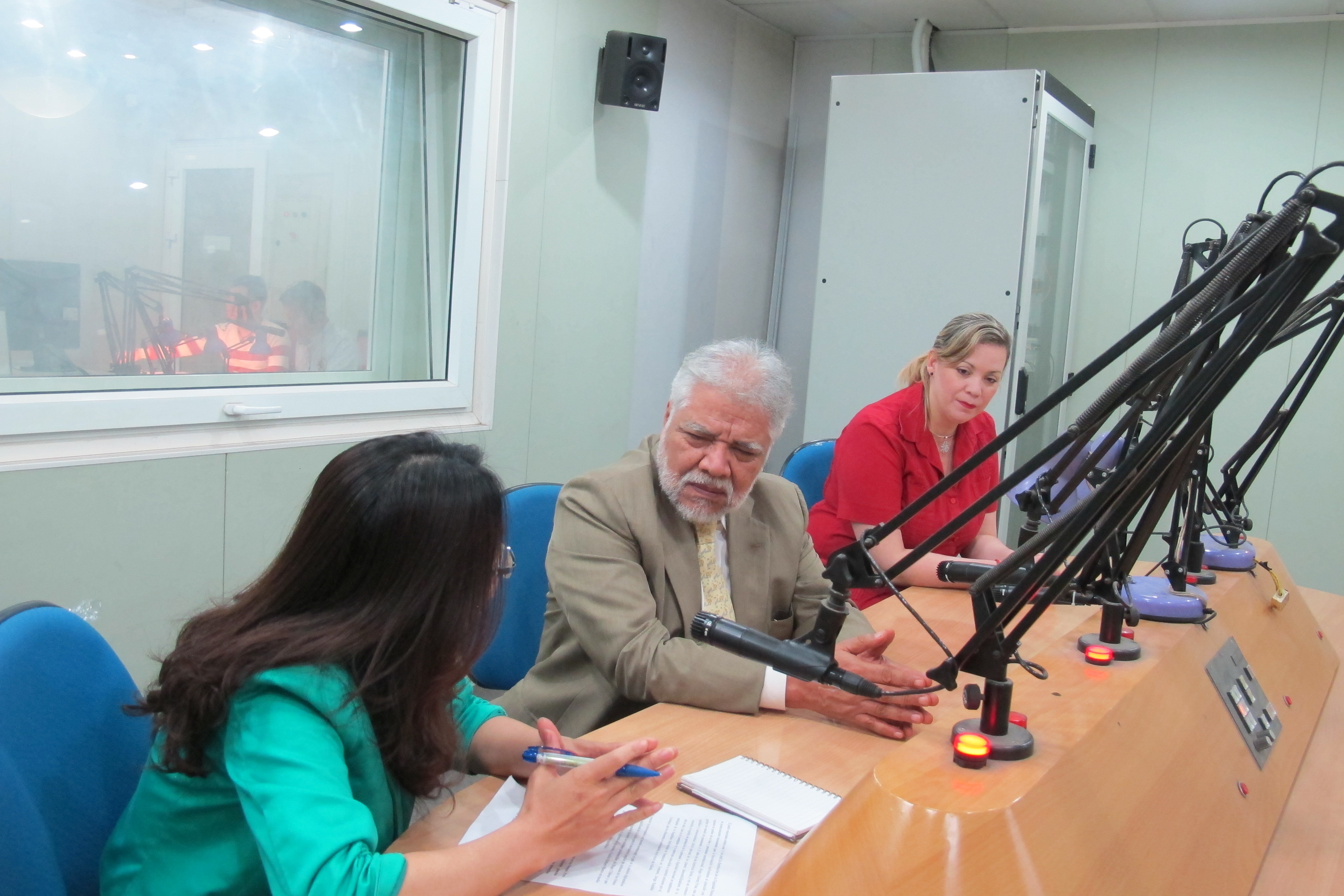 El embajador Jorge Rondón Uzcátegui y la ministro consejero Katiuska Maestre de Venezuela en la entrevista realizada en un estudio de la Voz de Vietnam