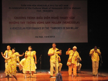 (VOVworld) - La vibrante percusión y el ritmo de las canciones presentadas por el grupo venezolano "Tambores de San Millán" dejaron una impresión especial para el público hanoiyense que lo presenció anoche en el Teatro de Trabajadores, en Hanoi. Este espectáculo forma parte de las actividades de la semana cultural de Venezuela en Vietnam, auspiciado por la embajada de ese país en Hanoi y el Centro de Artes Escénicas, del Ministerio vietnamita de Cultural, Deporte y Turismo.