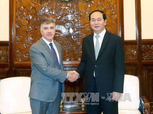 ![]() El exembajador saliente de Argentina en Hanoi, Claudio Gutiérrez (i) en su reunión de despedida con el presidente de Vietnam, Tran Dai Quang, efectuada el 22 de junio de 2016 (Foto: Nhan Sang/VNA)