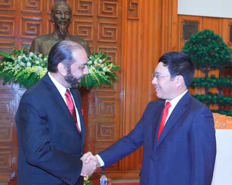 (VOVworld) – El gobierno vietnamita está interesado en profundizar la amistad y la cooperación con México en todos los ámbitos. Así lo apuntó el lunes el viceprimer ministro y canciller Pham Binh Minh en el recibimiento al presidente de la Comisión de Relaciones Exteriores para Asia-Pacífico del Senado de México, Teófilo Torres Corzo, quien se encuentra de visita de trabajo en Vietnam. En el encuentro, Binh Minh instó a fortalecer el intercambio de delegaciones de alto nivel y poner en práctica las consultas políticas entre las dos cancillerías para llegar a un acuerdo sobre el establecimiento de un Comité Mixto de Comercio, Inversión y Cooperación económica entre los dos países.