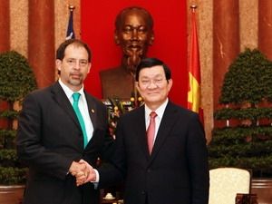 (VOVworld) - El presidente de Vietnam, Truong Tan Sang, recibió la víspera al titular del Senado de Chile, Guido Girardi, de visita en este país indochino. El jefe de Estado destacó el desarrollo incesante de las relaciones bilaterales de amistad, fortalecida por las visitas de delegaciones de alto nivel en los últimos tiempos, y la coordinación y apoyo mutuo en foros regionales e internacionales, como la APEC y la ONU.