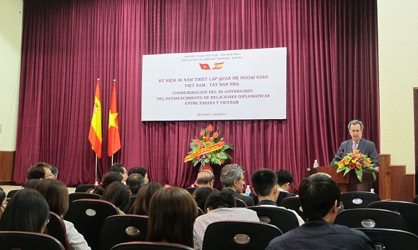 Expresando su simpatía con esta declaración, el embajador español en Vietnam, Alfonso Tena García, puntualizó: “Este acto de hoy no es simplemente la coincidencia de una fecha, de un aniversario, sino que tiene sentido en una relación que se ha consolidado, que ha crecido, y que tiene espacio para crecer más todavía. Como ustedes saben, el paraguas que cubre la relación bilateral es la asociación estratégica y el plan de acción, que se establecieron en 2009. En el ámbito del comercio y la economía, nuestros intercambios comerciales crecen año tras año, en 2012 se acercaron a los 2 mil millones de euros. Las empresas españolas están cada vez más presentes y en más sectores en Vietnam, los ejemplos más importantes en este momento son la construcción de la autopista Noi Bai-Lao Cai, los sistemas de transporte urbano rápido en Hai Phong y Hanoi, la línea de metro número 5 en Ciudad Ho Chi Minh y la línea de metro número 3 en Hanoi. Además de esto hay muchos proyectos que en el futuro podrán ser ejecutados por empresas españolas posiblemente en todos los ámbitos”.