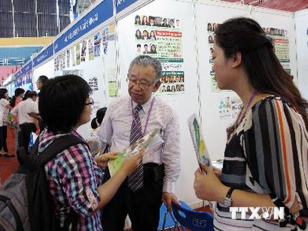 Estudiantes vietnamitas consultan informaciones en una exposición