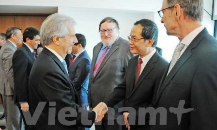![]() El presidente uruguayo, Tabaré Vázquez estrecha la mano con el embajador vietnamita Nguyen Dinh Thao (Foto: Vietnam+)