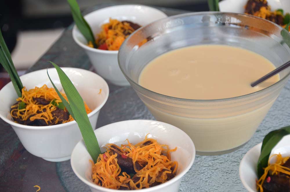 B: Yep. Sazli Nazim Ismail will elaborate. “You have to mix everything together, so you can feel different flavors in your mouth. In the past, the dessert is only served in the palace. When we have celebrations like the coronation of the King, when the prince or princess gets married, we only serve that pudding at that time. Now, everyone knows how to do it, everyone can eat. It had to be a four layered pudding. If you like more custard, you can add more custard, if you like more fruit, you can add more fruit, it’s up to you. But it had to be 4 layers.”