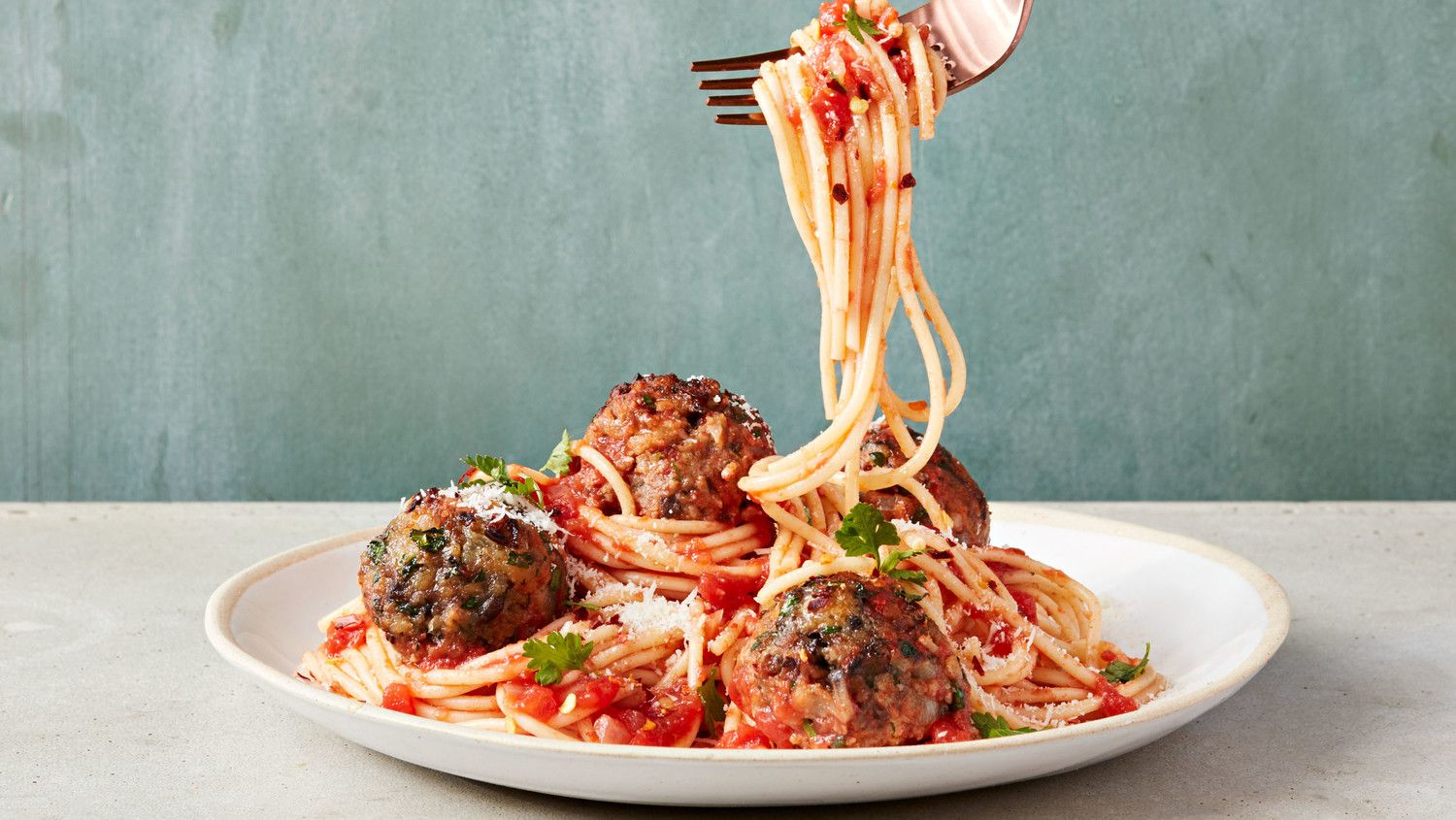 A: Got it. And when the meatballs are done, it’s serving time. Some people like to spoon the sauce and meatballs over the spaghetti, but I like to stir them all together and serve with parmesan and a few basil and oregano leaves. How about Andrew?