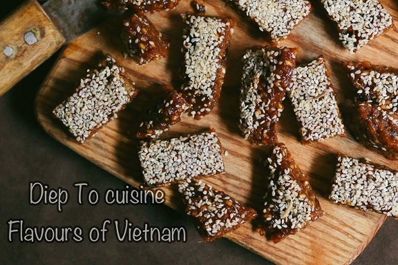 Diep To: Dry coconut candies. You thread the coconut, then you soak it in the white sugar over the night. The next day, you use a thick pot and cook it in the low heat. You stir it again and again until the sugar dries out. It coasts outside the coconut flesh, and then you eat it like candies.