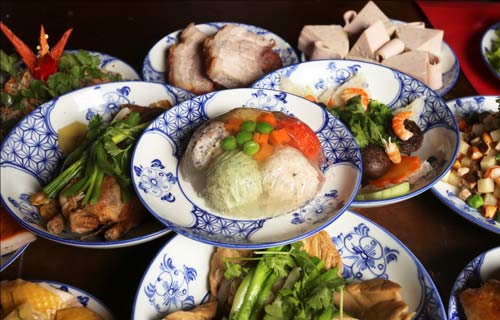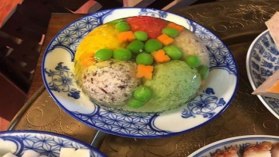 B: That’s right. For decoration, you can put boiled peas and carrots cut into flowers at the bottom of the bowl, and carefully arrange the meat balls on them before pouring enough the pig-skin stock to cover the meat. After about 5 hours in the refrigerator, the dish is ready to serve. Tip the jellied content of the bowl onto a flat plate and serve the beautiful five-colored jelly meatball cake to your delighted guest. “With their skilled hands, Hanoians combined familiar ingredients to create a colorful dish which embodies the spirit of Vietnam’s capital city. The custom of preparing Tet foods with five colors derives from the Asian belief in the five elements’ water, fire, wood, metal, and earth. So, the five-colored foods represent people’s hope for prosperity, good luck, good health, and happiness in the upcoming year.”