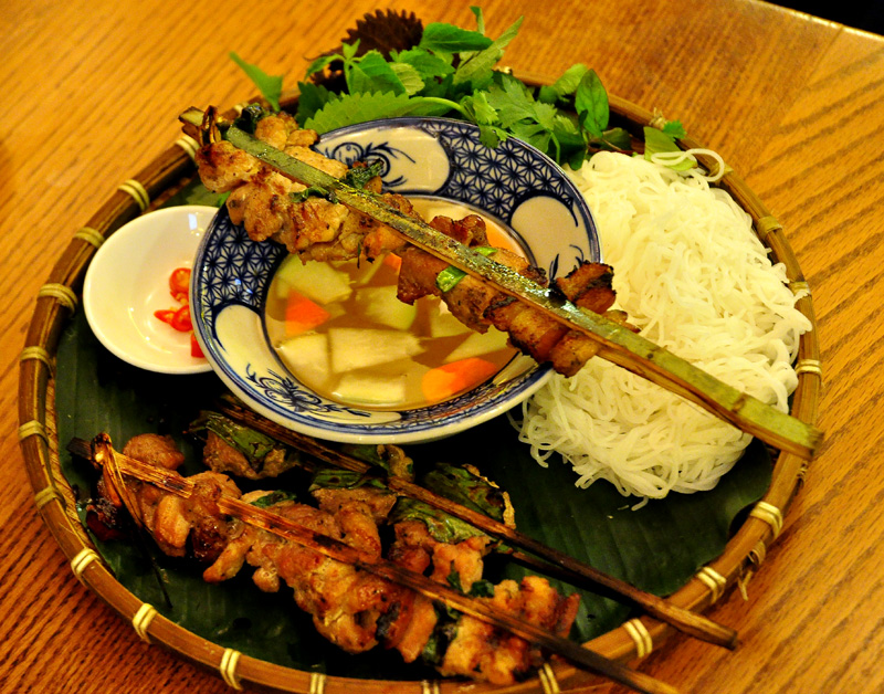 B: Wow. This is an old-style Bun cha. Instead of clamping the pork to the broilers, people use bamboo sticks to create a special flavor for the dish. Pieces of meat are grilled over charcoal, served with dipping sauce, noodle, and fresh vegetables; oh my, this dish will absolutely melt the most frozen heart of even the coolest customer.