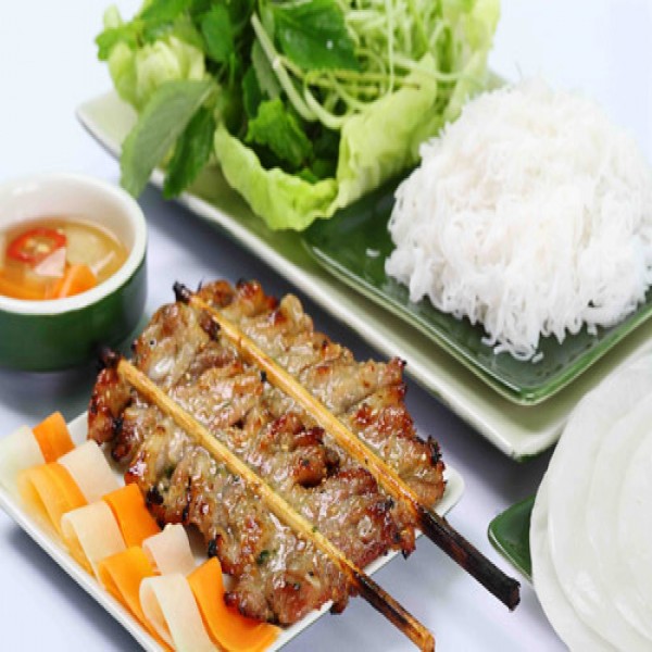 A: This dish truly reflects the style of ancient Hanoi cuisine from choosing the meat to marinating and serving. After being detached from the sticks, the grilled meat should be served hot with noodle and vegetables, including lettuce, mint herbs, perilla leaves, and so on.