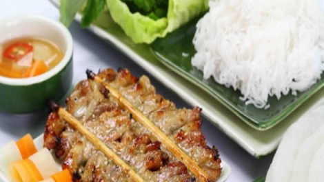 (VOVworld) - Bun cha is one of the most familiar street foods in Hanoi. It’s on the food list that foreigners must try in Vietnam. However, not everyone knows that there are many versions of the dish, for example, “grilled bamboo stick pork with noodle”. Instead of clamping the pork to the broilers, people use bamboo sticks to create a special flavor for the dish. Pieces of meat are grilled over charcoal, served with dipping sauce, noodle, and fresh vegetables; oh my, this dish will absolutely melt the most frozen heart of even the coolest customer