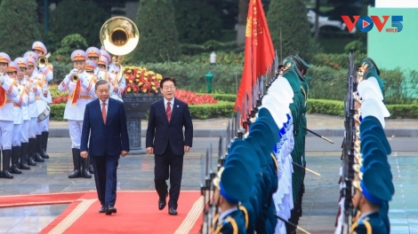 [VOVWORLD] - Ce mercredi après-midi à Hanoi, le secrétaire général du Parti communiste et président vietnamien Tô Lâm et son épouse ont présidé une cérémonie officielle en l’honneur du chef d’État sud-coréen et de son épouse, en visite d’État du 21 au 24 avril.