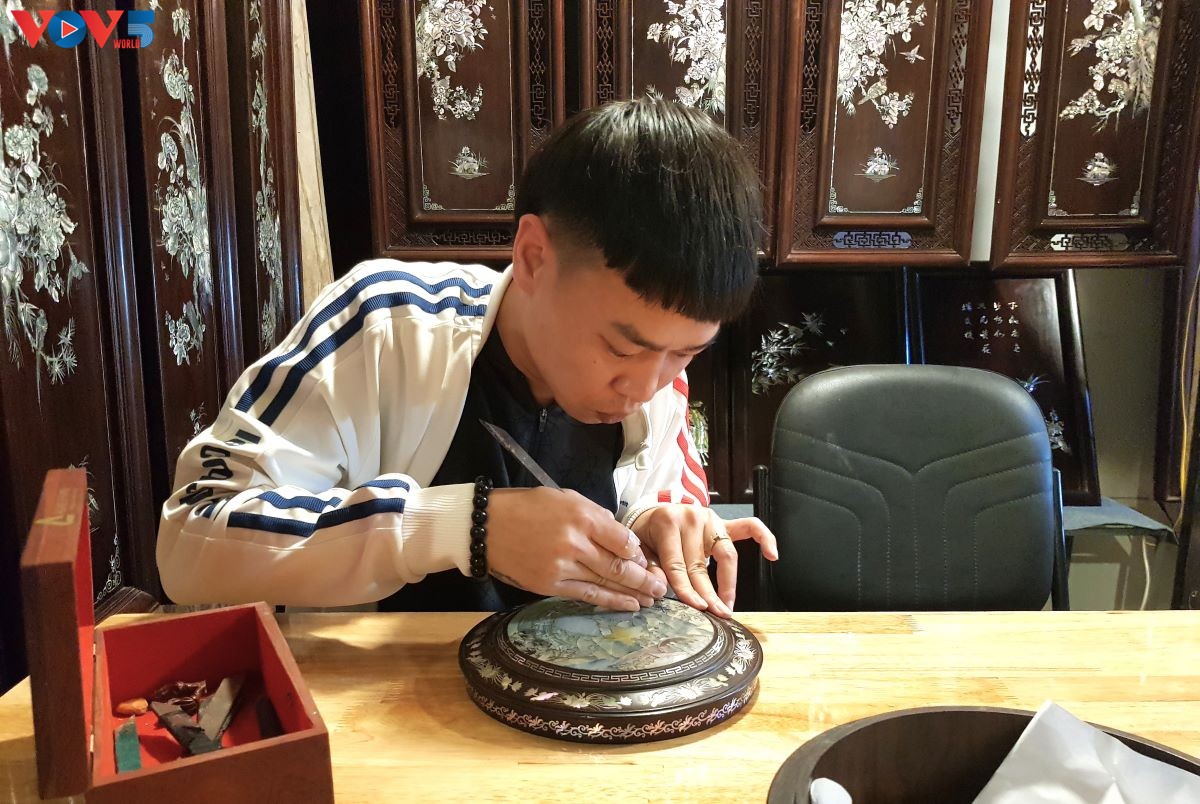 Un artisan présente le métier de marqueterie de nacre. Photo: Ngoc Anh/VOV5 |