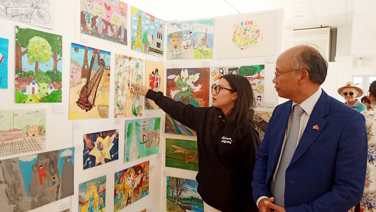 L’ambassadeur du Vietnam en France Dinh Toàn Thang à l'exposition présentant des dessins d'enfants vietnamiens. Photo: Nguyên Trong Tuyên/TTXVN |