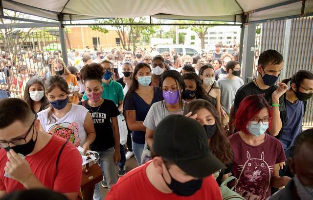 Des élèves font la queue pour passer l'examen national du lycée au Brésil, dans la région de Sao Paulo le 21 novembre 2021. Photo: Igor do Vale/Sipa USA/SIPA |