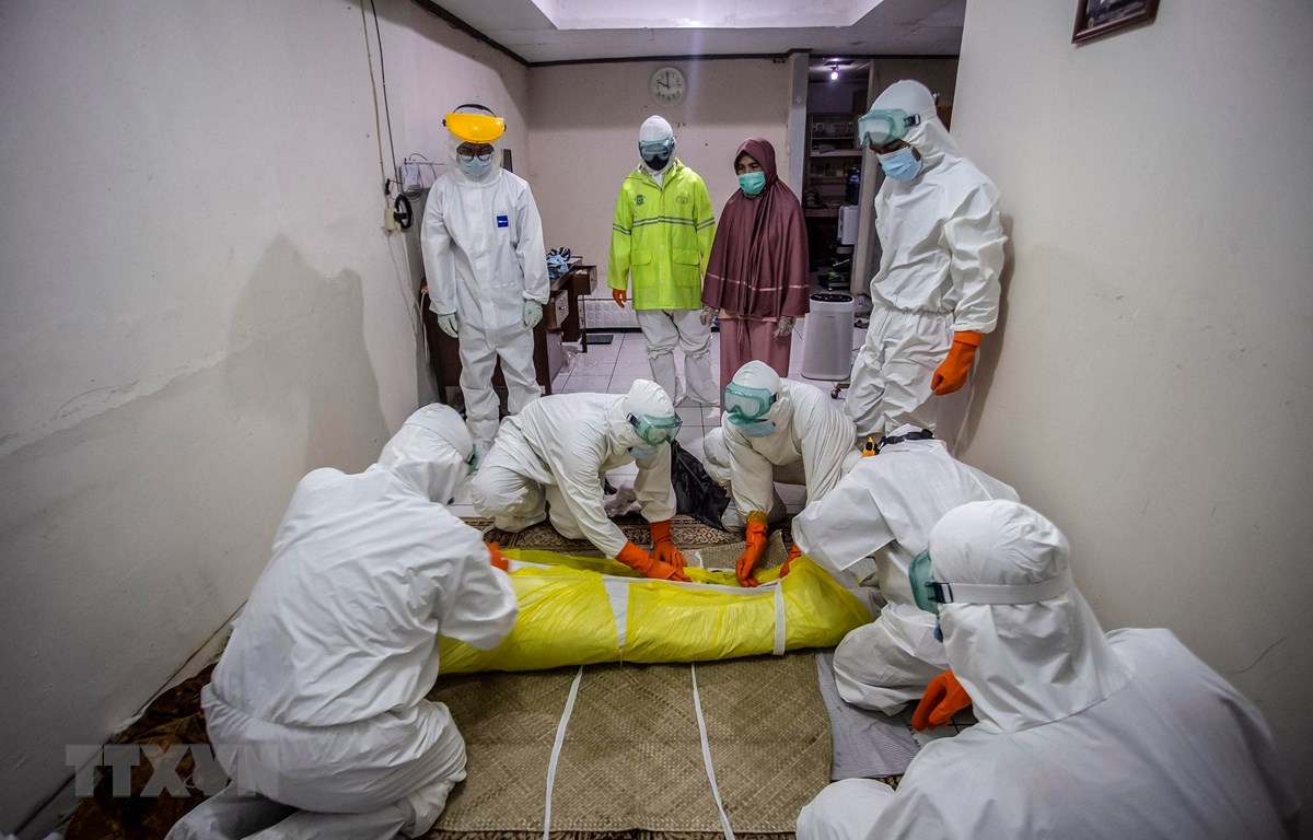 Une équipe enveloppe le corps d'un malade décédé de Covid-19 chez lui, à Bogor, dans la province de Java occidental, en Indonésie, le 6 juillet 2021. Photo: AFP/TTXVN |