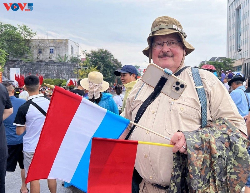 Roland Gaul, un touriste luxembourgeois, se distinguait au milieu de la foule des spectateurs avec les drapeaux vietnamien et luxembourgeois dans ses mains. Passionné par l'histoire vietnamienne, Roland Gaul connaît parfaitement les tenants et aboutissants de la Victoire de Diên Biên Phu. Il est venu au Vietnam 10 fois et à Diên Biên Phu 5 fois.