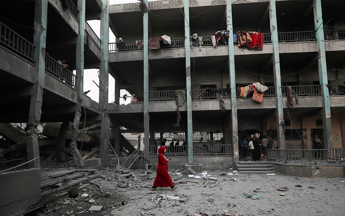 Des Palestiniens constatent les dégâts dans un abri, après une frappe aérienne israélienne, dans le camp de réfugiés de Jabalia. Photo: REUTERS/Mahmoud Issa |
