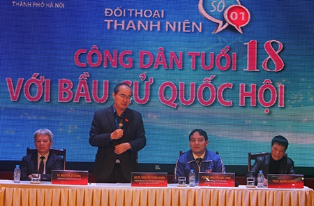 (VOVworld) - Le Comité national sur les jeunes et le comité populaire de la ville de Hanoï ont organisé ce mardi un dialogue avec la jeunesse sur le thème «Les citoyens de 18 ans avec les élections législatives». Cet évènement vise à sensibiliser les jeunes, ceux âgés de 18 ans notamment à participer aux élections législatives du 22 mai prochain. Nguyên Thiên Nhân, président du comité central du front de la patrie du Vietnam, a souligné: « Il faut soutenir les jeunes et les encourager à se présenter librement aux élections législatives. L’Union de la jeunesse communiste Ho Chi Minh doit les aider à s’impliquer dans la situation du pays et à rehausser leur confiance. Nous sommes convaincus que le Front de la patrie du Vietnam, l’Union de la jeunesse communiste Ho Chi Minh et le Conseil électoral national trouveront de nombreux jeunes candidats.»