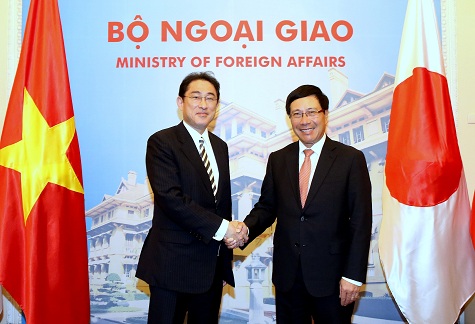(VOVworld) - Lors de leur entretien jeudi après-midi à Hanoi, le vice-Premier ministre et ministre des Affaires étrangères Pham Binh Minh et le ministre japonais des Affaires étrangères Fumio Kishida ont convenu de renforcer la confiance politique bilatérale par le biais du maintien des visites, des rencontres de haut rang et des dialogues entre les deux parties. «Le Japon va oeuvrer ensemble avec le Vietnam pour approfondir le partenariat stratégique», a déclaré le chef de la diplomatie japonaise, ajoutant que son pays allait intensifier sa collaboration avec Vietnam dans les opérations de maintien de la paix de l’ONU et l’aider dans la réparation des dommages de guerre, le déminage notamment.