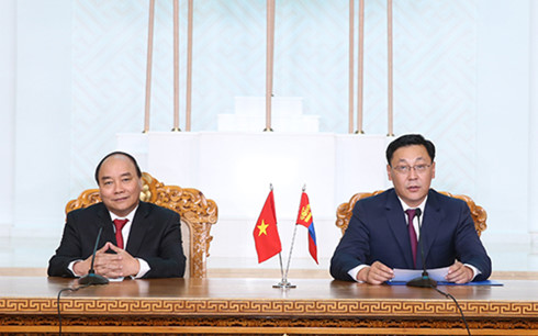 ![]() Le Premier ministre Nguyen Xuan Phuc et son homologue mongol Jargaltulga Erdenebat lors de la conférence de presse commune.