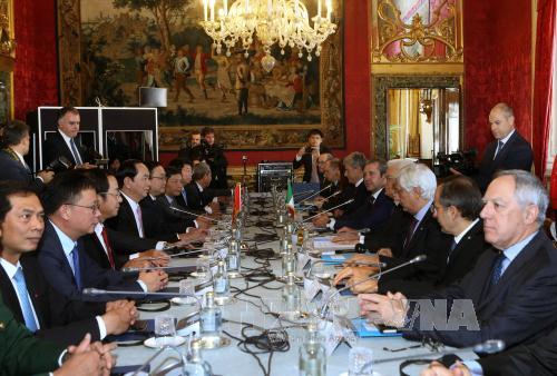 (VOVworld) - Mardi après-midi, heure de Hanoi, après la cérémonie d’accueil officielle en son honneur, le président vietnamien s’est entretenu avec son homologue italien. Tran Dai Quang et Sergio Mattarella ont affirmé leur volonté d’approfondir le partenariat stratégique Vietnam-Italie et de promouvoir les échanges entre les deux peuples pour rendre les relations bilatérales plus substantielles. Vietnamiens et Italiens ont décidé d'axer leur coopération bilatérale sur la formation professionnelle, la protection de l’environnement et la gestion des ressources en eau... Les deux dirigeants souhaitent aussi renforcer la coopération bilatérale dans la culture, l’éducation, le tourisme, les sciences et technologies. Les deux parties s’engagent à intensifier le partage d’information et d’expériences dans la lutte anti-criminelle, le sauvetage, le déminage et dans la participation aux forces de maintien de la paix de l’ONU. Les présidents vietnamien et italien revendiquent le maintien de la paix, de la stabilité, de la sûreté et de la liberté de navigation maritime et aérienne. Selon eux, les litiges en mer Orientale doivent être réglés par la voie pacifique, sur la base du droit international, la Convention des Nations Unies sur le droit de la mer de 1982 et la Déclaration sur la conduite des parties en mer Orientale (DOC).
