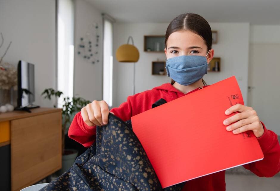 Une jeune collégienne au visage protégé par un masque en tissu préparant son sac. Photo: DAVID ADEMAS / OUEST-FRANCE |