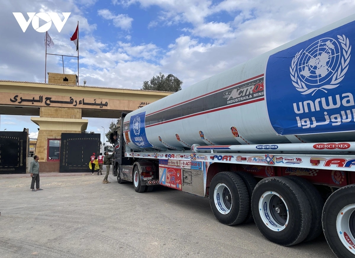Camions-citernes de l'ONU traversant le poste-frontière de Rafah depuis le Sinaï vers Gaza. Photo: VOV |