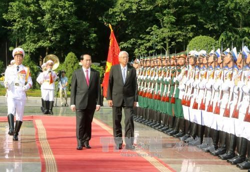 (VOVworld) - Le président du Myanmar, Htin Kyaw, a quitté ce vendredi après-midi Hanoi, terminant ainsi sa visite de trois jours au Vietnam, visite qu'il effectuait à l'invitation de son homologue Tran Dai Quang. Dans le cadre de cette visite, Htin Kyaw s’est entretenu avec le président Tran Dai Quang, a rencontré le secrétaire général du Parti communiste vietnamien Nguyen Phu Trong et le Premier ministre Nguyen Xuan Phuc. Vietnamiens et Birmans ont affirmé l’importance de leurs relations et se sont mis d’accords pour les développer. Les deux parties ont réitéré leur engagement à maintenir la paix, la stabilité et la sécurité de la région, à régler les litiges par voie pacifique, en respectant le droit international, dont la Convention des Nations Unies sur le droit de la mer de 1982.