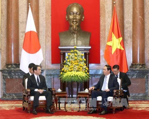 (VOVworld) - Le Japon est un partenaire de premier rang et de long terme du Vietnam, a affirmé le président Tran Dai Quang, qui recevait, ce vendredi à Hanoï, le ministre japonais des Affaires étrangères Fumio Kishida. Le chef de l’Etat a sollicité l’aide japonaise pour améliorer les compétences des forces vietnamiennes chargées de faire respecter la loi en mer et pour faire face au changement climatique, en invitant Tokyo à renforcer les échanges économiques et à accorder davantage d’aides publiques au Vietnam. Il souhaite également que le Japon soutienne la candidature vietnamienne au poste de membre non-permanent du Conseil de sécurité de l’ONU, mandat 2020-2021.