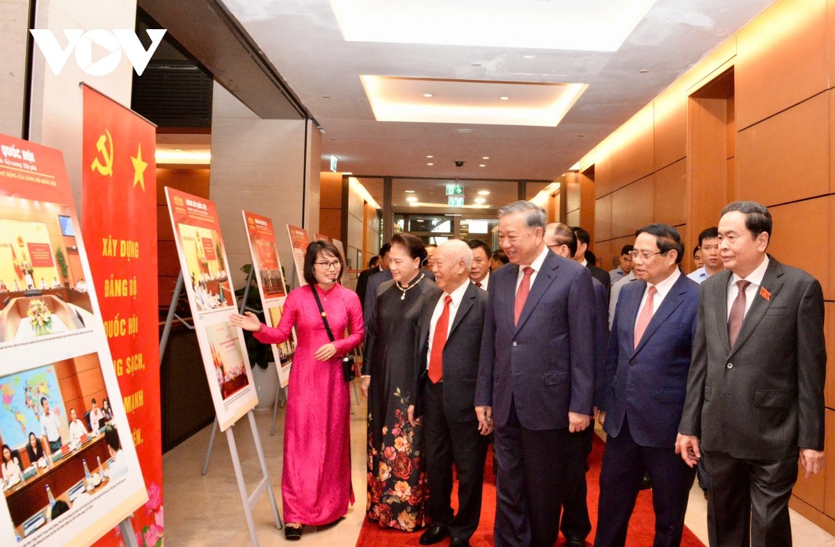 Le secrétaire général Tô Lâm, accompagné de dirigeants et d’anciens dirigeants du Parti et de l’État, visite une exposition à l’Assemblée nationale.Photo : Lê Tuyết/VOV |