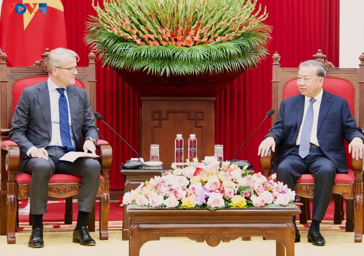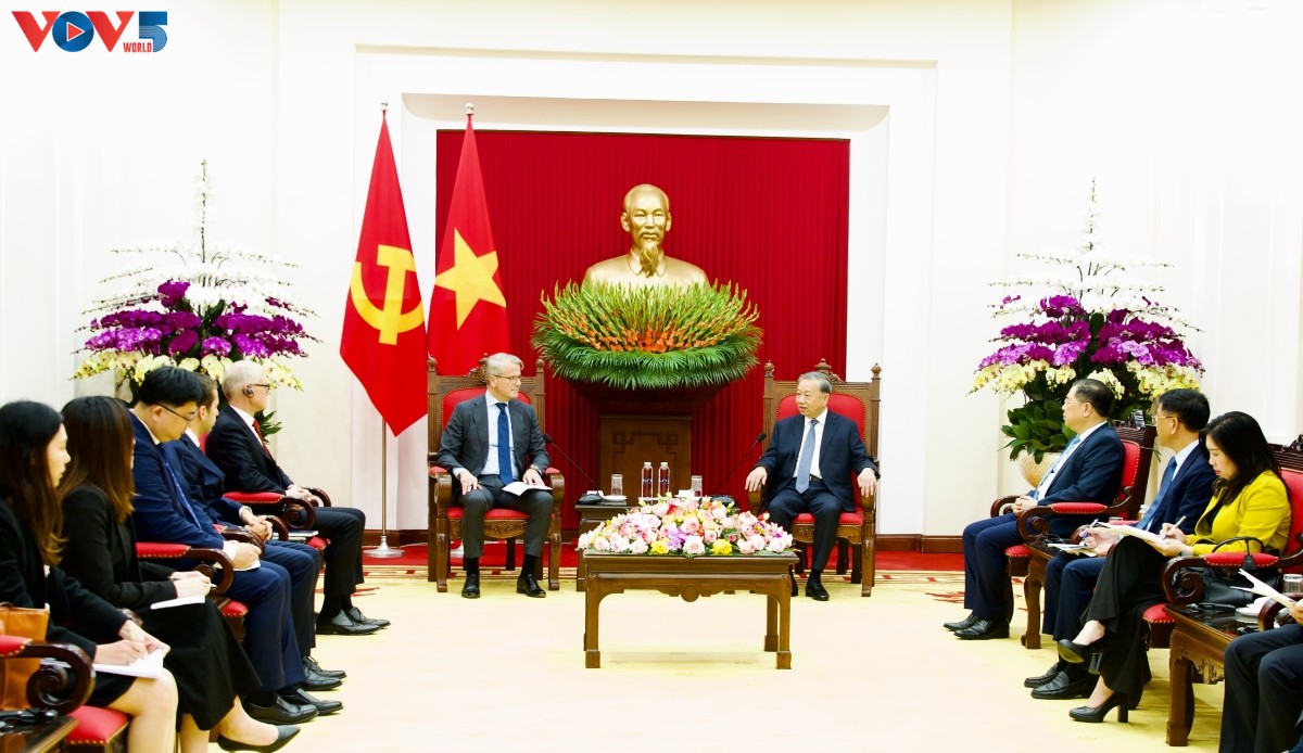 Le secrétaire général du Parti communiste vietnamien, Tô Lâm, rencontre Vincent Clerc, directeur général du groupe danois A.P. Moller – Maersk. Photo: Văn Hiếu/VOV |