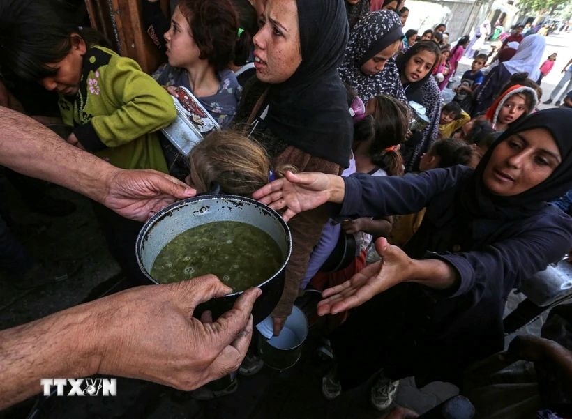 Des Palestiniens reçoivent leur aide alimentaire à Deir al-Balah, au centre de la Bande de Gaza, le 25 octobre 2024. Photo: THX/TTXVN |