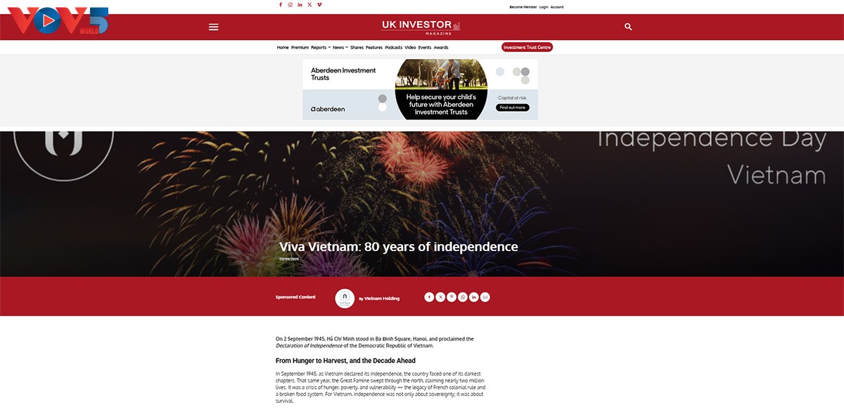 UK Investor est allé plus loin avec un article intitulé “Félicitations au Vietnam pour le 80e anniversaire de son indépendance”. Ce journal analyse le potentiel économique actuel du pays et encourage les investissements britanniques. Il affirme que “2025 est l’année de l’influence mondiale pour le Vietnam” et prédit qu’en 2035, le pays deviendra un modèle de croissance durable.