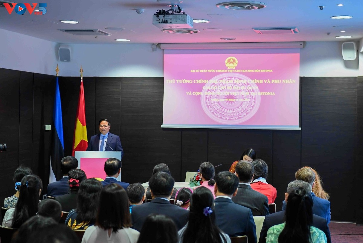 | Le Premier ministre vietnamien Pham Minh Chinh et son épouse rencontrent des représentants de la communauté vietnamienne vivant et travaillant en Estonie. Photo: Lai Hoa/VOV |