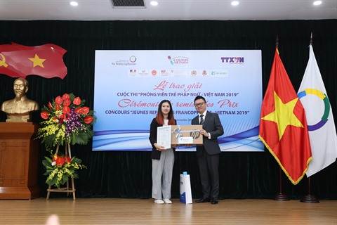 Lê Quôc Minh, directeur général adjoint de l'Agence Vietnamienne d'Information, remet le premier prix du Concours "Jeunes Reporters Francophones - Vietnam 2019". Photo: AVI