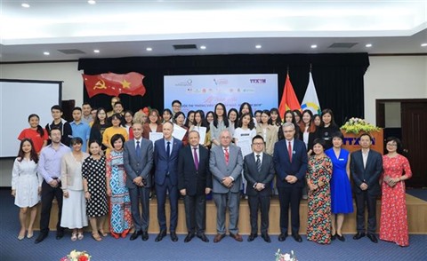 Les candidats du concours posent avec les dirigeants et représentants de la VNA, du ministère vietnamien des Affaires étrangères, du GADIF au Vietnam, des universités, lors de la cérémonie de remise des prix. Photo:VNA