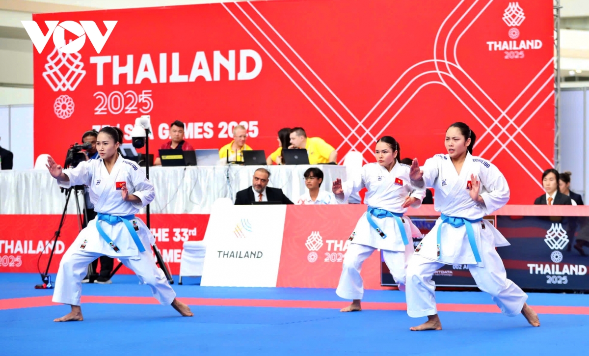 L’équipe féminine vietnamienne de kata décroche la 5e médaille d’or aux 33e SEA Games. Photo: Hoài Thương/VOV |