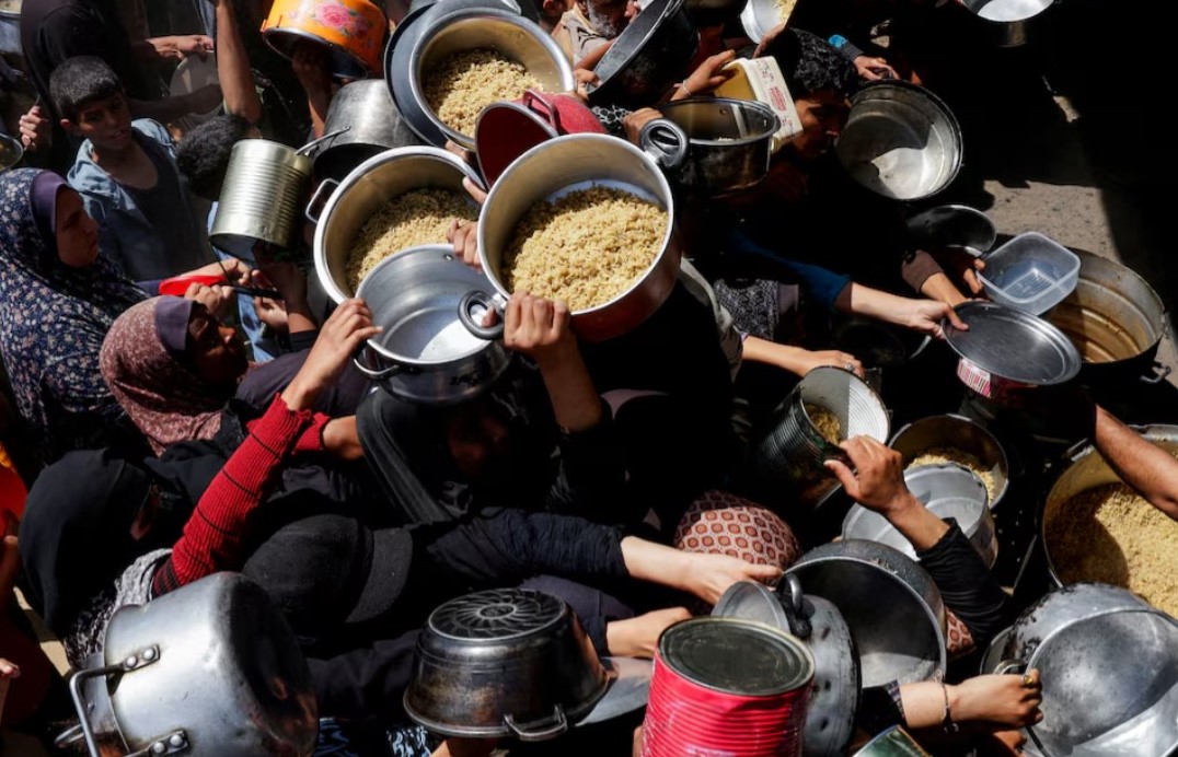 Des Palestiniens se rassemblent pour recevoir des repas préparés par une cuisine caritative à Khan Younis, dans le sud de la bande de Gaza, le 29 avril 2025. Photo d’archives: REUTERS/Hatem Khaled |