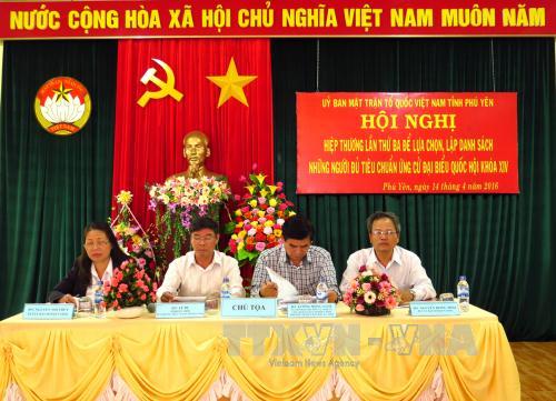 (VOVworld) - Les antennes du Front de la patrie du Vietnam dans plusieurs localités du pays ont tenu ce vendredi leurs troisièmes conférences consultatives en vue de finaliser la liste des candidats à l’Assemblée nationale, 14ème législature et celle aux conseils populaires provinciaux, mandat 2016-2021.