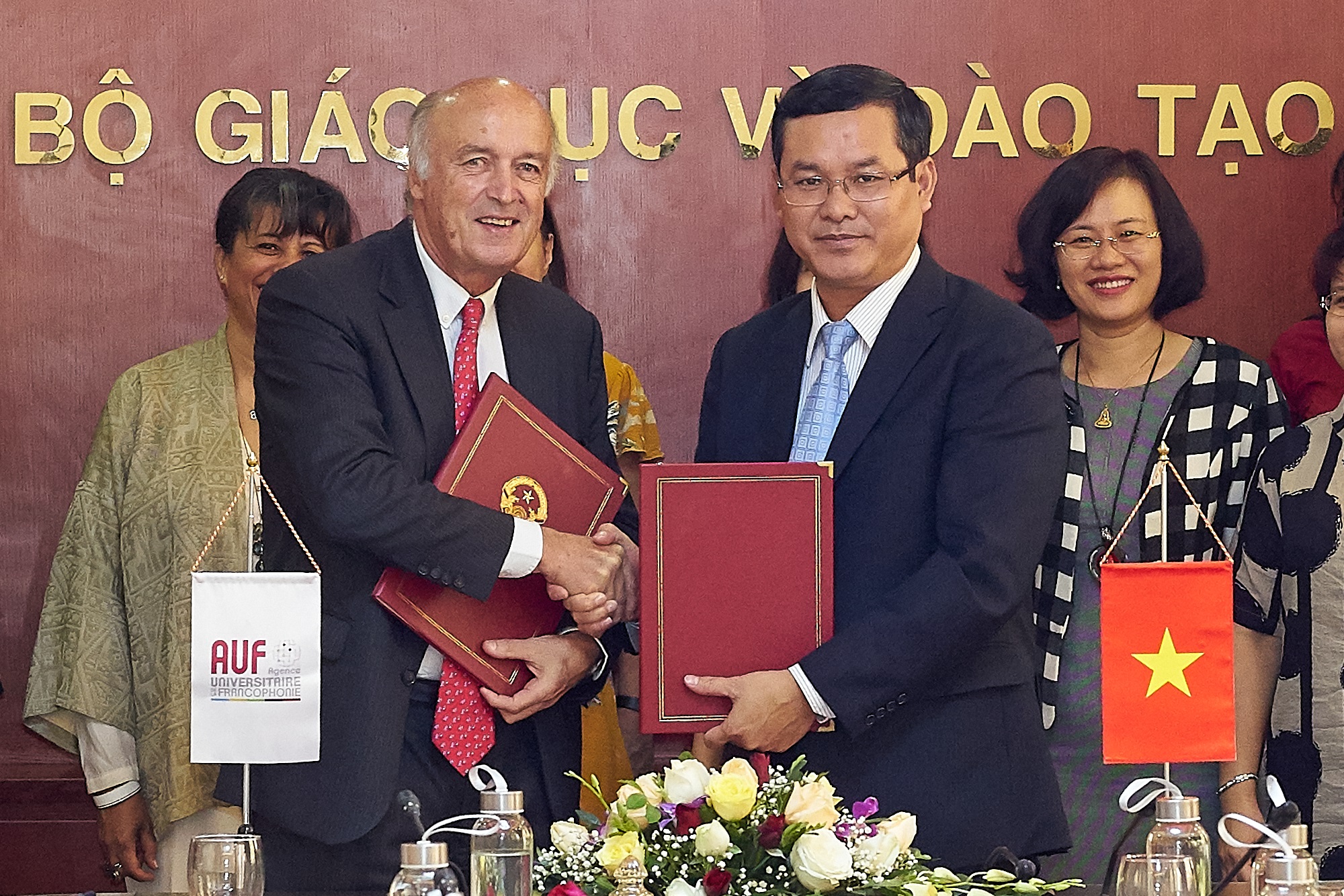 Jean-Paul de Gaudemar, Recteur de l’AUF, a déclaré: « Cette cérémonie de signature est très importante pour nous parce qu’elle formalise la coopération que nous conduisons avec le ministère de l’Education et notamment sa partie chargée de l'enseignement supérieur et de la recherche. Cette formalisation est importante parce que notre rôle en tant qu’association des universités qui regroupe beaucoup d’universités vietnamiennes, une soixantaine aujourd’hui, est de les accompagner dans leurs évolutions et dans leurs développements. L’apport de l’AUF consiste à faire profiter les universités vietnamiennes de l’expérience des centaines universités que regroupe notre réseau, notamment en matière d’autonomie mais également en matière de formation et de recherche... »