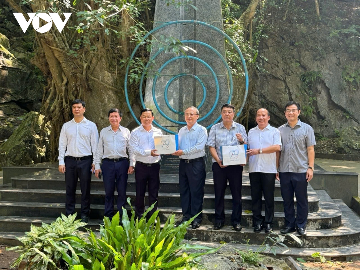 Les dirigeants du VOV remettent des cadeaux aux représentants du Comité populaire de la commune de Phung Châu à l'entrée de la grotte de Trâm. Photo: VOV |