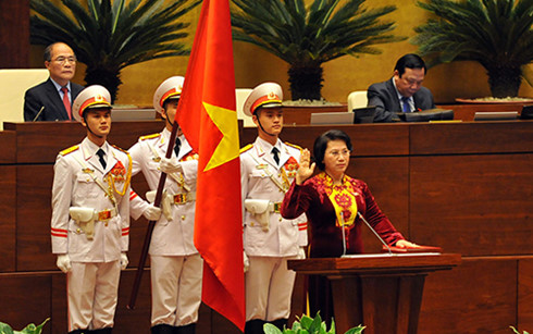 « L’Assemblée nationale prend acte du serment solennel de sa nouvelle présidente. Pour la première fois dans son histoire, l’Assemblée nationale de la République démocratique du Vietnam et maintenant de la République socialiste du Vietnam, a élu une femme, Nguyen Thi Kim Ngan, à sa tête. »