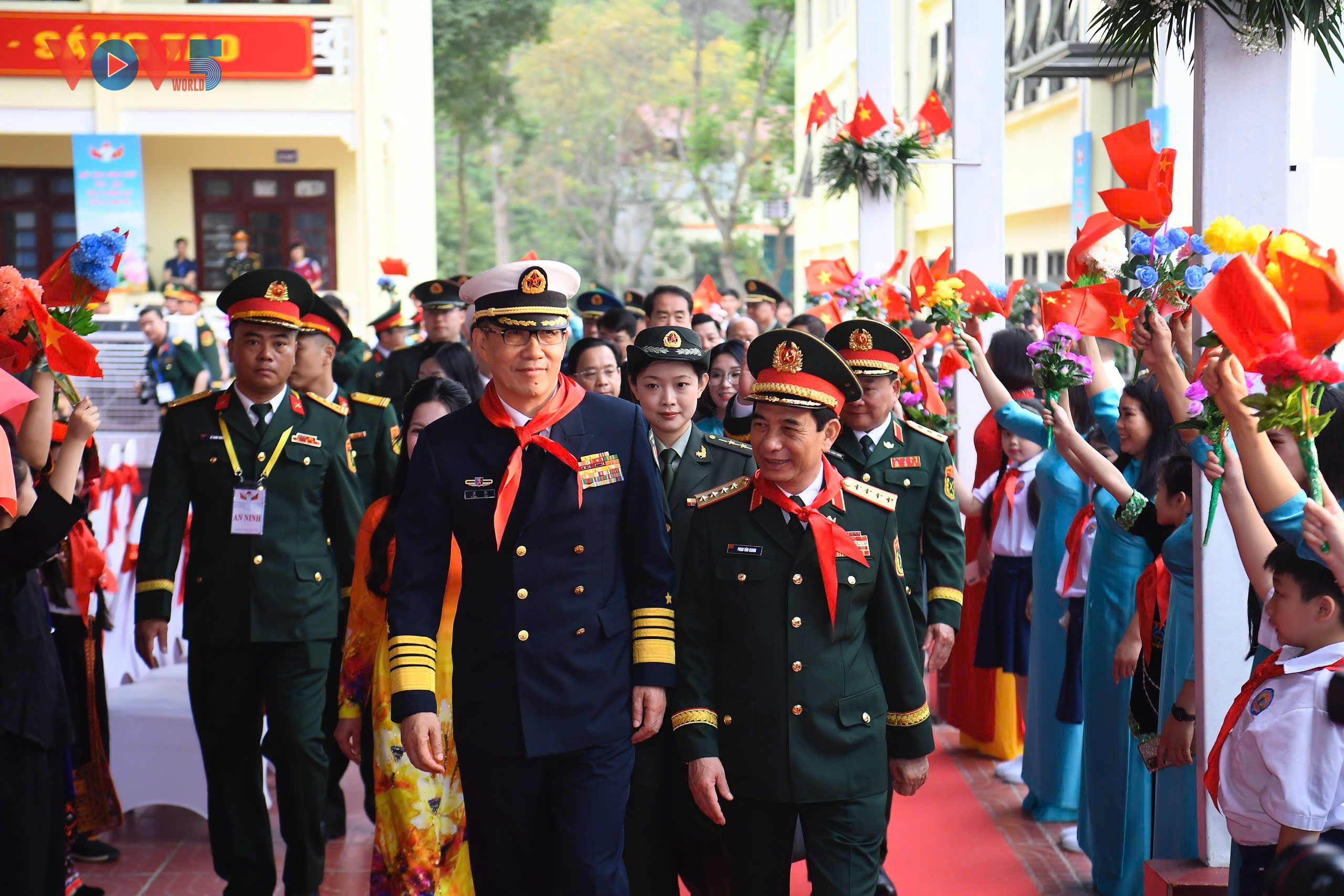Les délégations des ministères de la Défense des deux pays visitent l’école primaire de Dông Dang. Photo: Lê Phuong/VOV5 |