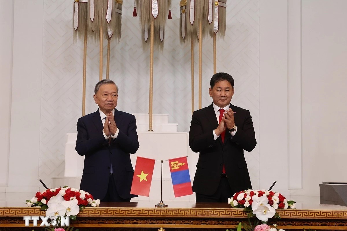 Le secrétaire général et président Tô Lâm (gauche) et le président mongol Ukhnaagiin Khurelsukh. Photo: Tri Dung/AVI |