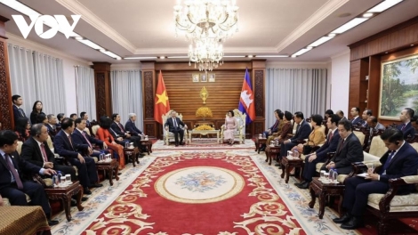 (VOVWORLD) - Le Président de la République Tô Lâm a rencontré ce samedi à PnomPenh la Présidente de l'Assemblée nationale du Cambodge, Khuon Sudary.