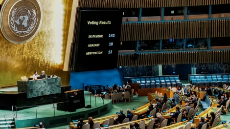 (VOVWORLD) - L’Assemblée générale de l’ONU a adopté, ce vendredi 12 septembre à New York, par 142 voix pour, 10 contre (dont celles des États-Unis et d’Israël) et 12 abstentions, une résolution dite “Déclaration de New York” en faveur d’une solution à deux États - Israël et Palestine - sans implication du mouvement islamiste Hamas.