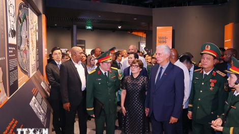 (VOVWORLD) - Dans le cadre de sa visite d’État au Vietnam du 31 août au 2 septembre, le Premier Secrétaire du Comité central du Parti communiste et président cubain, Miguel Díaz-Canel Bermúdez, accompagné de son épouse Lis Cuesta Peraza, s’est rendu dimanche après-midi au Musée d’Histoire militaire du Vietnam.
